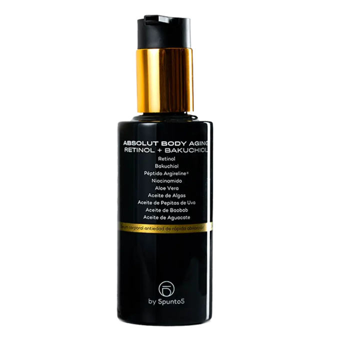 El serum antiedad corporal Absolut Body Aging de 5punto5 es un tratamiento de cuidado corporal diseñado para devolver la juventud y vitalidad a la piel. Absolut Body Aging presenta textura ligera y de rápida absorción, y está formulado con una potente combinación de ingredientes activos que trabajan en sinergia para ofrecer el mejor cuidado antiedad corporal. Absolut Body Aging incorpora en su formulación Péptidos, Retinol, Bakuchiol y Niacinamida.