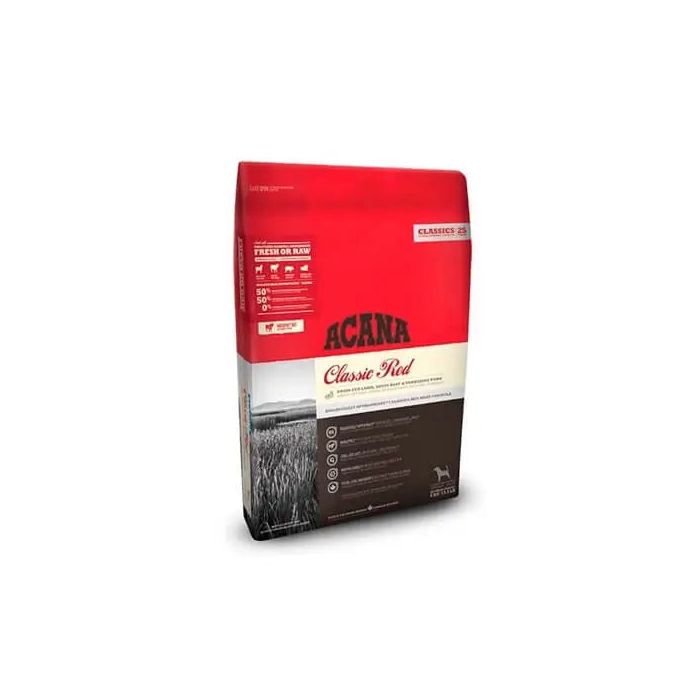 Acana Classic Red con cordero, carne de vacuno y cerdo El pienso para perros con cordero Acana Classic Red es un alimento completo y equilibrado indicado para perros de cualquier edad y raza. Esta prestigiosa marca canadiense elabora sus piensos con una alta cantidad de proteínas y pocos hidratos de carbono para proporcionarle toda la energía y vitalidad diaria que necesita y le ayude a que sus articulaciones y músculos estén fuertes y sanos. Los principales ingredientes de este pienso natural son la carne de res angus y el cordero alimentados en pastos y la de cerdo de animales criados en ranchos locales. Otros componentes importantes que incluye en una extensa variedad son la verdura y la fruta, que refuerzan su sistema inmune y aportan a tu perro fibra para contribuir a mejorar su digestión. Además, el pienso Classic Red de Acana le proporciona una cantidad precisa de ácidos grasos esenciales como omega 3, DHA y EPA que benefician a su pelo para que crezca fuerte y brillante y a su piel para que esté sana y tenga una correcta hidratación.El pienso Acana Classic Red pertenece a la nueva línea Acana Classics Biologically Appropriate que se caracteriza por incorporar un 50% de ingredientes animales de primera calidad, de los cuales un tercio es alimento fresco o crudo. La parte restante de ese tercio es carne seca o contiene aceites que conservan su proteína fuerte y natural. Los órganos, cartílagos y carnes frescas del pienso Acana Classics proporcionan nutrientes naturales que limitan notablemente la administración de suplementos sintéticos. La dieta natural de los perros contiene muy pocos carbohidratos, por lo que Acana Classic los limita y sustituye los hidratos de carbono rápidos como el maíz, el arroz o la patata por frutas y verduras de bajo índice glucémico. Gracias a esta sustitución se reduce considerablemente el almacenamiento de grasas y se regula el nivel de azúcar en sangre evitando problemas como la obesidad o la diabetes. Acana es una empresa canadiense que desde 1985 elabora piensos de alta calidad biológicamente apropiados para perros y gatos con ingredientes frescos y naturales de animales criados en libertad por personas de confianza. VENTAJAS DE ACANA CLASSIC RED PIENSO PARA PERROS CON CORDERO: Pienso equilibrado rico en proteínas para perros de cualquier edad y raza. Hecho con ingredientes frescos y crudos que aportan a tu perro vitalidad y energía. Tiene un 50% de ingredientes animales de los cuales un tercio es fresca o cruda. Incluye 3 carnes diferentes: cordero, res angus y cerdo yorkshire frescos. Limita los hidratos de carbono. Contiene omega 3, DHA y EPA para mantener la piel y el pelo sanos y fuertes. USO Y ESPECIFICACIONES: Pienso para perros adultos de cualquier raza con carne de res angus, cordero y cerdo de animales alimentados en pastos y criados en ranchos locales que les aporta vitalidad y energía gracias a su gran proporción de carne. El pienso para perros Acana Classic Red con cordero tiene un sabor natural e intenso gracias a su carne fresca que lo convierte en la comida favorita de los perros más exigentes.
