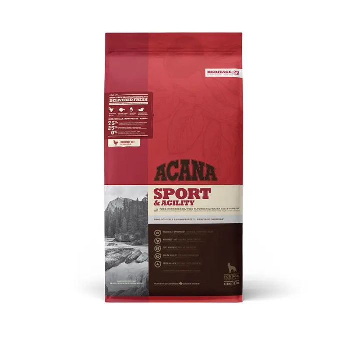 Comida con pollo de corral Acana Heritage Sport & Agility para perros con mucha actividad Los perros con mucha energía siempre están ocupados, ya sea corriendo en el parque, haciendo aglity, canicross o ¡pastoreando ovejas! Por ello, ACANA Sport & Agility contiene un 35% proteínas y grasas de origen animal, que proporcionan toda la energía y resistencia que los perros activos necesitan. Le aportará los nutrientes y la energía necesaria para que siga haciendo ejercicio con vitalidad. Contiene una gran cantidad de carne de pollo criado en libertad que aporta las proteínas necesarias para que tu perro esté sano. También incluye huevos frescos procedentes de granjas locales y platija salvaje. Los perros deportistas necesitan un aporte extra de proteínas y grasas para que su ritmo activo pueda mantenerse durante todo el día. Este pienso contiene una gran cantidad de frutas y verduras que favorecen la digestión y estimulan la flora intestinal. Y su alto contenido en pescado le aporta los ácidos grasos omega 3 y omega 6 esenciales en el mantenimiento de su sistema inmunitario, y para que tenga una piel elástica y un pelo brillante. Acana Sport & Agility es el mejor alimento que puedes dar a tu atlético perro para que esté ágil y fuerte. Es una dieta equilibrada y sana creada por Acana, marca que solo utiliza componentes naturales y de calidad para la elaboración de sus productos. Además, apuesta por ingredientes locales para una mayor calidad y un sabor inigualable. La firma es un referente en la alimentación animal, ya que todos sus productos están elaborados en función de las necesidades del animal, ofreciendo una gama muy variada. VENTAJAS: Pienso equilibrado indicado para perros deportistas. Aporta todos los nutrientes y energía diaria que necesitan. Está elaborado con ingredientes de primera calidad, sin conservantes. Contiene fruta y verdura para una fácil digestión. Contribuye al mantenimiento del sistema inmunitario. USO Y ESPECIFICACIONES: Dieta sana y equilibrada para perros deportistas de cualquier raza que aporta la energía, las vitaminas y proteínas necesarias. Recomendaciones de uso: Sirve el pienso seco o ligeramente humedecido. Para ayudar a mantener la frescura, se recomienda sellar bien la bolsa y guardarla en un lugar fresco y seco. Visita a tu veterinario regularmente.Con el pienso Acana Sport & Agility tu perro obtendrá toda la energía y seguirá con la gran actividad que le caracteriza.