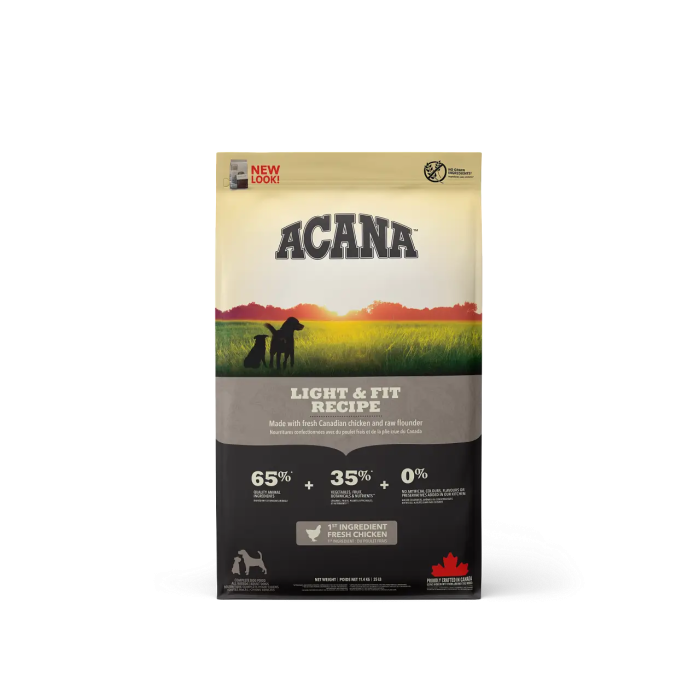 Acana Light & Fit Pienso completo para perros adultos con sobrepeso Los perros con sobrepeso necesitan una dieta rica en proteínas para mejorar la masa muscular, aunque limitada en carbohidratos que puedan contribuir al exceso de grasa corporal. El pienso para perros Acana Light & Fit Adult es un alimento para perros adultos con sobrepeso. ACANA Light & Fit tiene una composición a base de pollo de corral, platija salvaje y huevos frescos de corral, incluyendo carne, cartílagos, huesos y órganos, para proporcionar todos los nutrientes que estos perros con tendencia al sobrepeso necesitan para mantener su peso ideal. Esta comida para perros contiene un 35% de proteínas para conseguir que tu mascota se mantenga en el peso adecuado. Es un pienso que está elaborado con pollo Cobb, pescado y huevos frescos de granjas locales, y que aporta a tu perro la cantidad de proteína necesaria para el correcto mantenimiento de sus músculos. Los ingredientes de este alimento son productos frescos, sin cereales y sin conservantes, llevados diariamente a las fábricas de Acana para darle a tu perro un alimento sano y nutritivo. Los perros con exceso de peso pueden llegar a sufrir problemas de salud graves, como la diabetes o enfermedades cardiacas. Para que tu mascota tenga una alimentación completa es necesario añadir la proporción adecuada de vegetales a su dieta. Este pienso de Acana incorpora a su fórmula frutas y verduras frescas como la calabaza Butternut, las peras Barlett o las manzanas Delicious, que son fuentes naturales de vitaminas para una alimentación saludable. La fuente de omega 3 del pescado fresco ayuda a que tu mascota conserve un pelo brillante y una piel sana a la vez que cuida de su sistema inmunitario. Las algas orgánicas y hierbas vigorizantes de este pienso favorecen la buena digestión y un metabolismo activo. La misión de los piensos Acana Heritage es ofrecer una variedad de alimentos ricos y frescos, cultivados de forma sostenible en las granjas regionales y cocinados en sus propias cocinas. Los piensos Acana Light & Fit están elaborados con más tipos de carne, muy ricos en proteínas, con carbohidratos y azúcares limitados y con todo el sabor y los nutrientes necesarios para el correcto desarrollo y bienestar de los perros en cada fase de su vida. VENTAJAS DEL PIENSO ACANA LIGHT & FIT: Pienso completo para perros adultos con sobrepeso. Sin cereales. Alimento con un alto contenido proteico y bajo en grasas. Con frutas y verduras frescas para una alimentación saludable. Evita la acumulación de grasa y reduce la sensibilidad a la insulina. Enriquecido con omega 3 para una piel y un pelo sanos. USO Y ESPECIFICACIONES: Pienso para perros adultos de razas grandes con sobrepeso con un 35% de proteínas y bajo en grasas para el mantenimiento de la masa corporal y la pérdida de pesoCuida el peso y la salud de tu mascota mientras ahorras con el pienso para perros adultos Acana Light & Fit