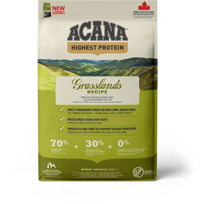 Comida para perros de ingredientes naturales y carne fresca Acana Regionals Grasslands Acana Grasslands es una comida de calidad para perros adultos elaborada con los mejores productos que ofrecen las ricas y fértiles tierras canadienses. Gracias a su fórmula con proteínas de alta calidad, tendrás la seguridad de estar alimentando correctamente a tu perro. Contiene un 70% de ingredientes animales y está elaborado con cordero local, criado en los ranchos de Alberta. Su cuidado es completamente natural, ya que no se le inyectan antibióticos, hormonas y ni conservantes. Además, contiene ingredientes adicionales que completan esta receta perfecta para todo tipo de razas y tamaños. Los huevos enteros aportan proteínas y la grasa necesaria para que tu perro esté lleno de energía. También, completamente natural y criado en libertad es el pato que, además, se le da una dieta de cereal para que mantenga todo su sabor.Acana Grasslands contiene un 30% de frutas y verduras llenas de antioxidantes para que tu mascota tenga una salud de hierro y un sistema inmunitario inmejorable. Los vegetales orgánicos y las plantas botánicas mejoran su metabolismo y nutren el tracto digestivo. Además, la piel y el pelaje de tu perro estarán resplandecientes y sanos gracias a los ácidos grasos omega 3. Pensado para que tu perro no acumule grasa y prevenirle de la diabetes este alimento no contiene cereales como maíz o arroz que provocan un notable aumento de azúcar en sangre. La gama de productos de Acana reflejan la riqueza local y la diversidad de alimentos que hay en el oeste de Canadá, ya sea en la tierra como en el mar. Con un sabor inigualable, en cuanto tu perro pruebe el pienso Acana Grasslands no querrá cambiar. VENTAJAS: Pienso para perros adultos elaborado con ingredientes naturales y frescos. Su fórmula contiene un 70% de ingredientes animales y un 30% de frutas y verduras. Tiene un rico sabor a cordero (sin conservantes). No contiene cereales con alto índice glucémico como el maíz o el arroz. Nutre el tracto digestivo y mejora su metabolismo. USO Y ESPECIFICACIONES: Alimento sano y rico en proteínas para perros adultos de todas las razas, para que estén llenos de energía y vitalidad.Los ingredientes naturales, frescos y locales de Acana Grasslands mantienen a tu perro fuerte, sano y feliz.