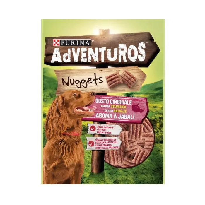 Chuches para perros con sabor intenso a jabalíLos snacks Purina Adventuros Nuggets con aroma a Jabalí son un alimento complementario para perros rico en carne y bajo en grasas que a todos les encanta por su alta palatabilidad. El excitante aroma a jabalí y su delicioso sabor acompañado de su textura fácil de masticar hará que tu perro se vuelva loco por comerselos.En cuanto abres la bolsa puedes apreciar y oler el excesivo aroma a carne sin tener ni que acercarte porque huele de forma espectacular. Los Nuggets de Purina son exquisitos y les encantará incluso a los perros más exigentes con la comida. Tienen un color marrón claro y una forma cuadrada y mullida en tiras compactadas masticables que puedes separar fácilmente. De esta forma puedes darle la chuche entera o partirla en los cachos que quieras, dándole tiras sueltas o partiéndola en varias tiras conjuntas. Partiendo el snack en tiras podrás darle hasta en 12 veces la misma unidad, durando de esta forma mucho más tiempo y disfrutándolo el doble.Estos deliciosos snacks tienen un sabor intenso y están hechos para perros con un espíritu natural aventurero, para dárselos en casa, de paseo o en cualquier lugar gracias a su pequeño y cómodo tamaño que te permite llevarlo en cualquier sitio.Su gran palatabilidad y textura blanda y mullida los convierte en la recompensa perfecta para cachorros y perros ancianos que les cuesta comer. Las características de estos nuggets hacen que cualquier perro pueda comerlas a diario sin perjudicar a su salud debidoAdventuros Nuggets con aroma a Jabalí pertenece a la nueva línea de snacks de Purina Adventuros. Si a tu perro le gusta la variedad, prueba con los distintos sabores, formatos y texturas de los otros snacks. Los Adventuros Strips son tiras con aroma a venado que pueden ofrecerse enteras o partidas en trozos pequeños y los Mini Sticks son palitos consistentes con aroma a búfalo rugosos por fuera y rellenos por dentro perfectos para darlos enteros.