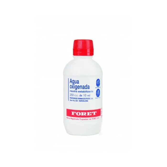 Cada 100 ml de solución de Agua Oxigenada Foret contiene 3 gr de peróxido de hidrógeno, que equivale a 10 volúmenes. El resto de excipientes son: ácido fosfórico.