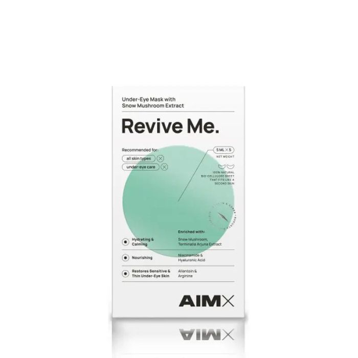 «»Revive Me": ¡directo al objetivo!Todo lo que la piel de debajo de los ojos necesita: hidratación, luminosidad, rejuvenecimiento.Relaja y refresca los párpados.Repone la piel con vitaminas y minerales.Mascarilla concentrada de acción rápida.Lámina de biocelulosa 100% natural que se adapta como una segunda piel.Fabricada en Corea del Sur.«»Revive Me«» es una potente mascarilla para debajo de los ojos que hidrata e ilumina visiblemente la piel.Su incomparable fórmula AimX revitaliza la piel con la ayuda del hongo Snow, la niacinamida y el ácido hialurónico.La lámina está fabricada con biocelulosa, que actúa como una segunda piel al tiempo que ayuda a fijar la fórmula reparadora y favorece la penetración eficaz de los principios activos.Enriquecida con Snow mushroom, niacinamida, ácido hialurónico y otros extractos vegetales de origen natural.Hidrata intensamente la piel sensible de debajo de los ojos y ayuda a reducir las bolsas.Proporciona a la piel un brillo luminoso y ayuda así a eliminar los signos de fatiga.Repone la piel con vitaminas y minerales.La mascarilla perfecta para lograr el objetivo antienvejecimiento.El amplio espectro de ingredientes activos repone ricamente la piel con una variedad de sustancias diferentes, lo que mejora el estado general de la piel en su conjunto.Fabricado en Corea del Sur de acuerdo con las normas GMP».
