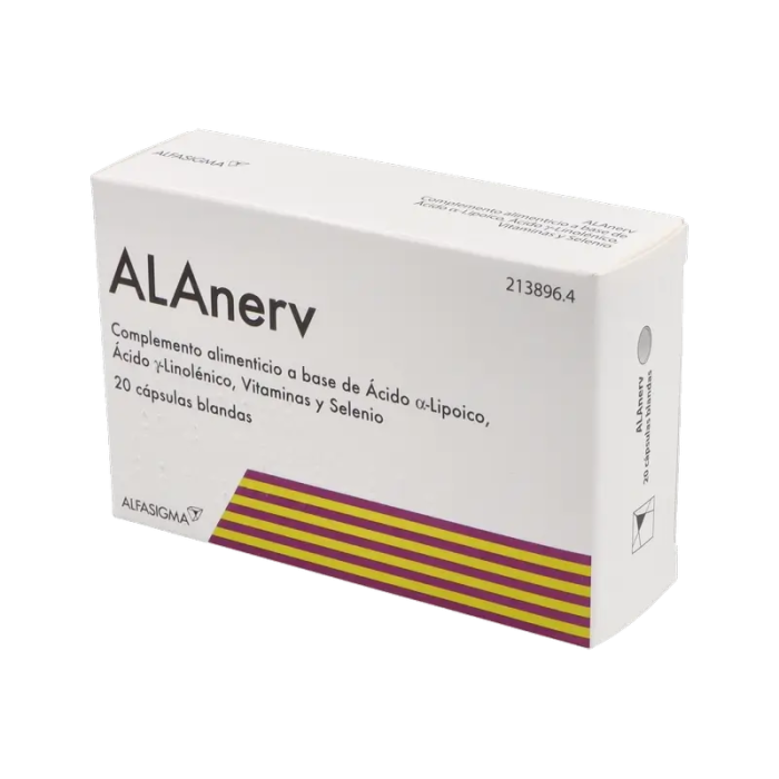 En situaciones de estrés oxidativo y cuando no es suficiente con el sistema de defensa antioxidante endógeno para eliminar o neutralizar a estos radicales libres, es necesario la suplementación exógena con antioxidantes, para así eliminar el exceso de radicales libres.ALAnerv es un complemento alimenticio contra el estrés oxidativo a base de Ácido a-Lipoico, Ácido ?-Linolénico, Vitamina B1, B2, B5, B6, Vitamina E y Selenio.Valor energético por cápsula: 3,8 kCal / 15,9 kJ. Cada cápsula contiene: Vitamina E (Tocoferol): 7,50 mg Vitamina B1 (Tiamina): 1,05 mg Vitamina B2 (Riboflavina): 1,20 mg Vitamina B5 (Ácido pantoténico): 4,50 mg Vitamina B6 (Piridoxina): 1,50 mg Selenio: 25 mcg