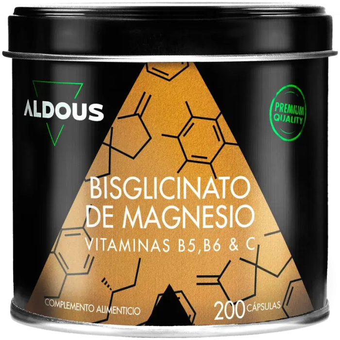 La formulación avanzada de Aldous Labs combina el Bisglicinato de Magnesio con Vitamina C, B5 y B6. Se presenta en un envase de 200 cápsulas. Nuestro Magnesio se presenta en cápsulas vegetales que aportan una mayor concentración y pureza y una máxima absorción y fácil digestión del producto.Beneficios● Vitaminas para el cansancioAyuda a reducir el cansancio y la fatiga, al funcionamiento normal del sistema nervioso y a conciliar el sueño.● Articulaciones y músculosContribuye al funcionamiento normal de los músculos y junto con la Vitamina B6 ayuda a aliviar las contracciones musculares o calambres. Modo de usoTomar 2 cápsulas vegetales al día con suficiente líquido.IngredienesBisglicinato de Magnesio, Cápsula de origen vegetal (agente de recubrimiento: Hidroxipropilmetilcelulosa), Agente de carga: celulosa microcristalina, Ácido L-Ascórbico (Vitamina C), Ácido pantotenico (vitamina B5) y Clorhidrato de piridoxina (vitamina B6)AdvertenciaNo superar la dosis diaria recomendada. Los complementos alimenticios no deben utilizarse como sustitutos de una dieta equilibrada. Si se están tomando medicamentos, es oportuno consultar con el médico. No utilizar durante el embarazo o la lactancia. Mantener fuera del alcance de los niños más pequeños. Solo para adultos. Conservar en un lugar fresco y seco.