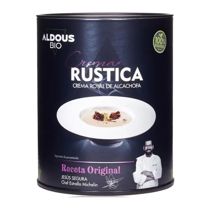 La crema Rústica Aldous Bio es una Crema Gourmet Royal de Alcachofa elaborada a partir de la receta de por Jesús Segura (Chef con Estrella Michelin) para que te alimentes de manera saludable y consciente. Sorprende a amigos y familiares con un producto gourmet, elaborado con ingredientes ecológicos a partir de receta de chef con estrella michelín, con un packaging reutilizable que tiene una segunda vida y protege al alimento de la luz ultravioleta. Ingredientes reales, libres de conservantes, colorantes, aditivos, y sin azúcar añadido.