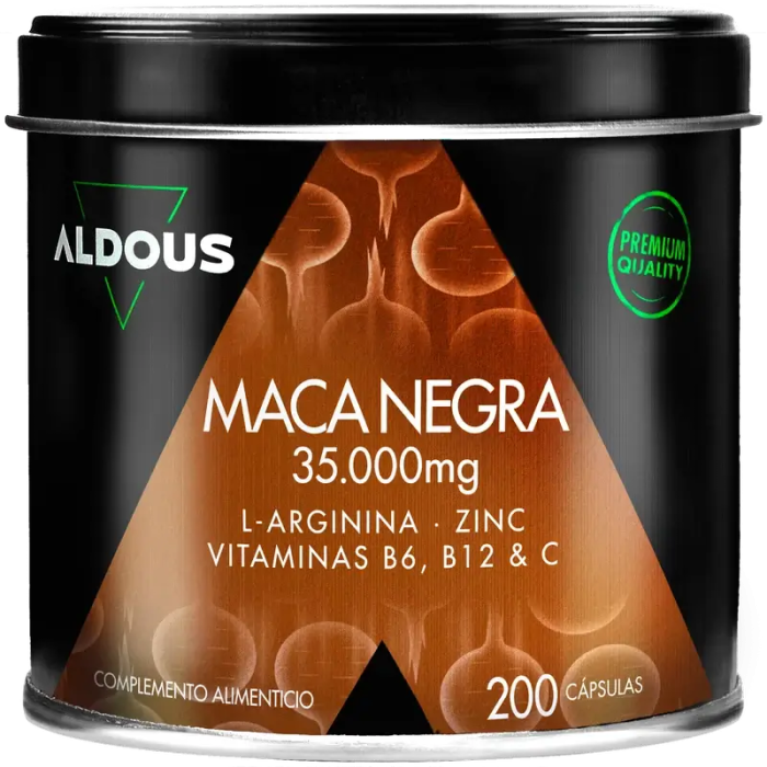 La formulación avanzada de la Maca Andina Negra peruana Aldous se presenta en 200 cápsulas y está compuesta por Arginina, Zinc, Vitamina C, B12 y B6Beneficios● EnergíaContribuyen a combatir el cansancio y la fatiga.● AfrodisíacaEstimula el deseo sexual e influye positivamente en la fertilidad.● MenopausiaAyuda para la fortaleza y la salud de los huesos durante la menopausia.Modo de usoTomar de 1-4 cápsulas al día.IngredientesExtracto seco de raíz de maca negra 20:1 (Lepidium mayenii walp.), cápsula vegetal (agente de recubrimiento: hidroxipropilmetilcelulosa), L-arginina, Vitamina C (ácido ascorbico), extracto seco de bambú, L-leucina, citrato de zinc, agente de carga: celulosa microcristalina, Vitamina B6 (clorhidrato de prirdoxina), Vitamina B12 (cianocobalamina)AdvertenciasLos complementos alimenticios no deben utilizarse como sustitutos de una dieta equilibrada y variada ni de un estilo de vida saludable. No utilizar duante el embarazo o la lactancia. No superar la dosis diaria recomendada. Mantener fuera del alcance de los niños más pequeños. Conservar en lugar fresco y seco.