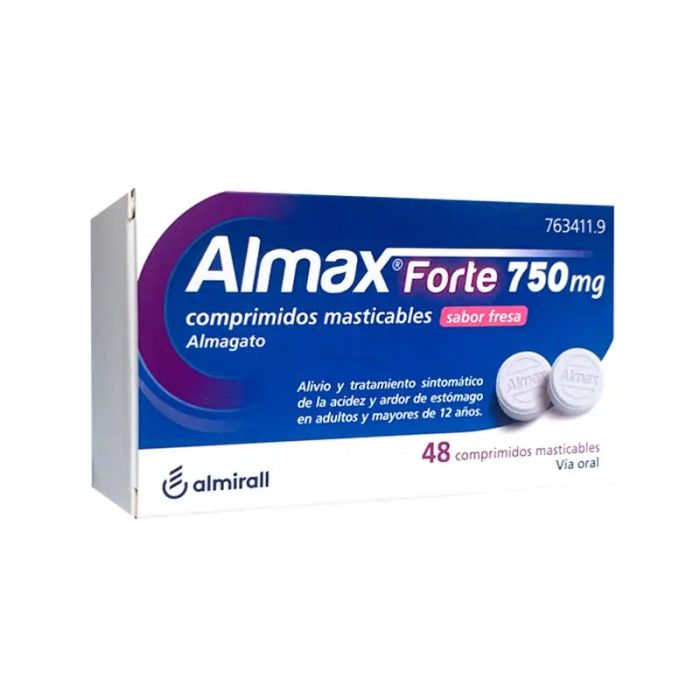 Almax forte 750 mg Sabor Fresa, contiene 48 comprimidos masticables.