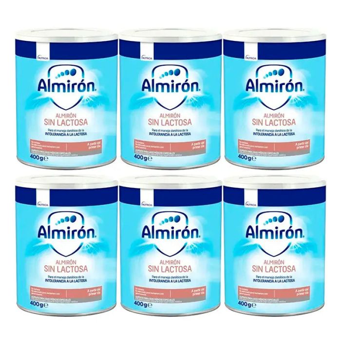Almirón Sin Lactosa 6 x 400 gramos. Contiene 6 botes de 400 gramos cada uno.