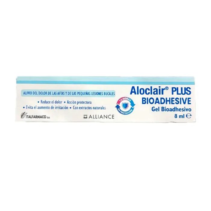 Aloclair Plus Gel Bioadhesivo, 8 ml de ItalFarmaco, incluye activos efectivos como el aloe vera con efecto calmante, y el ácido hialurónico con bajo peso molecular, que benefician el proceso de alivio y cicatrización en lesiones bucales localizadas.