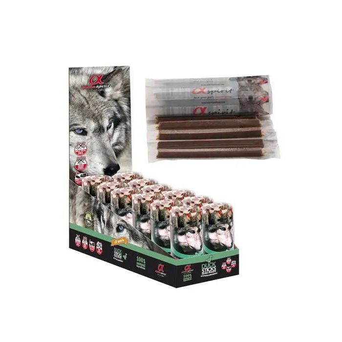 Alpha Spirit te trae unas barritas deliciosas con sabor a pato, para perros, hechas con ingredientes totalmente naturales y de calidad, suministrados por proveedores locales.Su suave textura e intenso sabor son irresistibles para el perro. Tienen hasta un 85% de carne y pescado fresco. Son envasadas individualmente para facilitar su manipulación y conservación. Y, por si fuera poco, gracias a su preparación a baja temperatura conservan todas sus propiedades nutricionales.Son Hipoalergénicas al no contener harinas cárnicas. Empleamos nuestro propio método: Tin Sulphate que ayuda a la creación de cartílago articular.Contienen omega 3, omega 6 y chondroinentes que refuerzan el sistema inmunitario del perro y ayudan a tener una piel sana y pelo más brillante. Al no tener cereales evita el sarro.Además, los snacks de Alpha Spirit tienen una palatabilidad muy alta, son pequeños y suavesNuestros productos están recomendados por veterinarios.VENTAJAS:Sabrosos, pequeños y suaves snacks.Ingredientes 100% naturales.Hasta un 85% de carnes y pescado fresco.No contiene cereales.Sin gluten.Sin harinas cánicas.No extrusionado.Alta palatabilidad.Excelente digestibilidad.Muy baja sensibilidad alergénica.Rico en omega 3, omega 6 y sulfato de condroitina.Regenera el cartílago articular.Estimula el brillo y la fuerza del pelo.Fortalece el sistema inmunológico.Previene el sarro de los dientes.Producto recomendado por veterinarios.Sin saborizantes ni colorantes añadidos.No manchan.USO Y ESPECIFICACIONES:Snack para perros.Una vez abierto el producto puede conservarse por 30 días, y hasta un año y medio sin abrir.Retira el envoltorio antes de ofrecer a tu mascota.Snack para mascotas no para humanos.