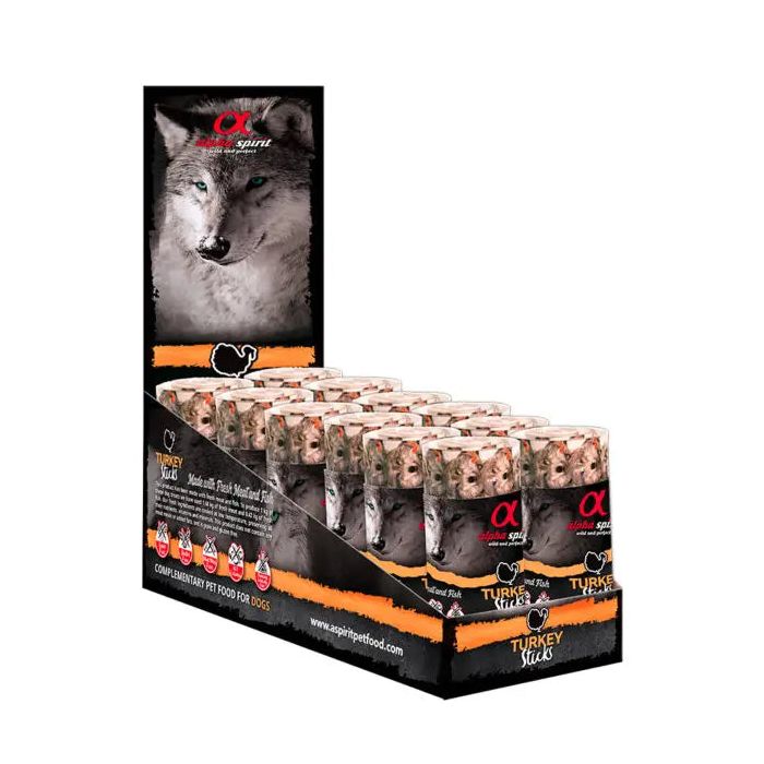 Alpha Spirit barritas naturales de carne fresca para perros de todas las edadesEl snack para perros Alpha Spirit pavo hará las delicias de tu mascota. Una golosina natural que aporta un exquisito sabor y una agradable textura, ideal para recompensar o premiar a tu perro. Sus ingredientes naturales y frescos mejoran las funciones fisiológicas: cardiovascular, visual y cognitiva, y son el suplemento ideal a la dieta diaria de tu mascota.El irresistible snack para perros Alpha Spirit está elaborado con un 35% de pavo fresco, un 20% de pollo fresco, un 20% de pescado entero fresco y un 10% de hígado de cerdo fresco. Estos snacks están elaborados siguiendo unos sistemas de calidad que aseguran todo su sabor y propiedades durante mucho más tiempo, con una caducidad de hasta 18 meses. Es perfecto como premio o recompensa para tu mascota, ya que es muy saludable y nutritivo.Esta golosina natural aporta los nutrientes necesarios para la vida cotidiana de tu perro. Incluye aminoácidos naturales que contribuyen al desarrollo cognitivo, a la agudeza visual de tu fiel amigo y ayudan a reducir el riesgo de enfermedades cardiovasculares.La tecnología “Tenderize Technology” que utiliza Alpha Spirit en sus productos garantiza la calidad de sus snacks y su excelente sabor. Para una alimentación apropiada es importante prestar atención a la calidad de las golosinas que les ofrecemos a los animales. Los snacks Alpha Spirit no contienen cereales o harinas de hueso y se componen de carne fresca y natural 100%.VENTAJAS DE LAS BARRITAS ALPHA SPIRIT SABOR PAVO:Barritas de pavo muy nutritivo y saludable para perros.Golosina con un irresistible sabor elaborada con un 85% de carne fresca.Alta durabilidad y buena conservación, con fecha de caducidad de 18 meses.La tecnología “Tenderize Technology” en su fabricación garantiza su calidad.Con ingredientes naturales y frescos que mejoran las funciones fisiológicas.Sin cereales ni gluten.Sin harinas cárnicas. USO Y ESPECIFICACIONES:Barritas con ingredientes frescos y naturales que suponen un alimento complementario de calidad para la dieta diaria de los perros, mejorando determinadas funciones fisiológicas.Complemento ideal para adiestrar, educar o jugar con tu mascota.