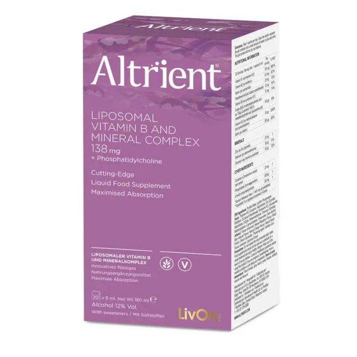 La mayoría de las formas del complejo vitamínico B (comprimidos, cápsulas, polvos, líquidos y fuentes dietéticas) no permanecen completamente en el organismo. El cuerpo solo puede retener cantidades limitadas de vitamina B ya que es soluble al agua, por lo que cualquier exceso se excreta con la orina. Dar con un suplemento que ofrezca una alta biodisponibilidad de vitamina B es esencial para que el cuerpo pueda mantener sus niveles de energía.La solución perfecta pasa por escoger el complejo de vitamina B y minerales de Altrient. Este complejo liposomal único es capaz de proveer una tasa de absorción mucho mayor que la de otros productos del mercado. Altrient B utiliza ingeniosa tecnología TEL para encapsular los nutrientes dentro de diminutas burbujas de fosfolipídicos que esquivan el sistema digestivo, transportando el contenido directamente a las células que lo necesitan (lo que permite ofrecer casi un 100% de biodisponibilidad).