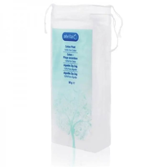 Algodón en zig-zag de 50 gramos, ideal para uso higiénico y cosmético.