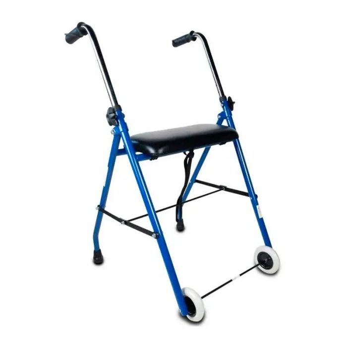 dispone de dos ruedas, sistema plegable, asiento de PVC acolchado y puños anatómicos que pueden ajustarse en altura y permiten descansar cada vez que se necesite.