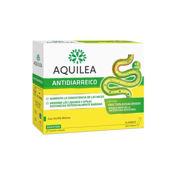 Aquilea Antidiarreico. Con arcilla blanca para absorber los líquidos y otras sutancias potencialmente dañinas, aumentar la consistencia de las heces y así reducir las veces que necesitamos ir al baño. Permite la eliminación de las toxinas de forma fisiológica. Reequilibra y promueve el crecimiento de la microflora intestinal gracias a los prebióticos frutcooligosacáridos.