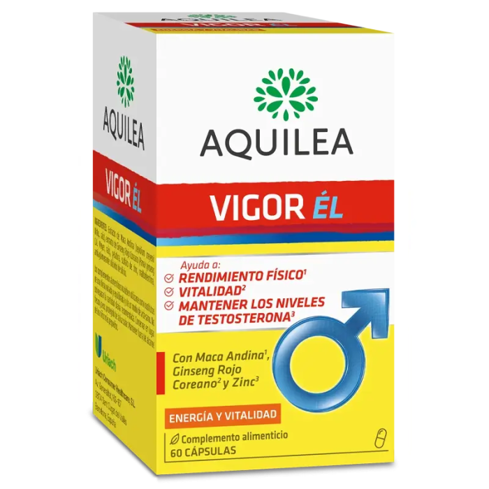 Aquilea Vigor Él contiene: extracto de raíz de ginseng rojo coreano; Maca andina; Zinc; Gelatina; Maltodextrina; Sulfato de zinc; Óxido de silicio; Dióxido de titanio; Indigotina.