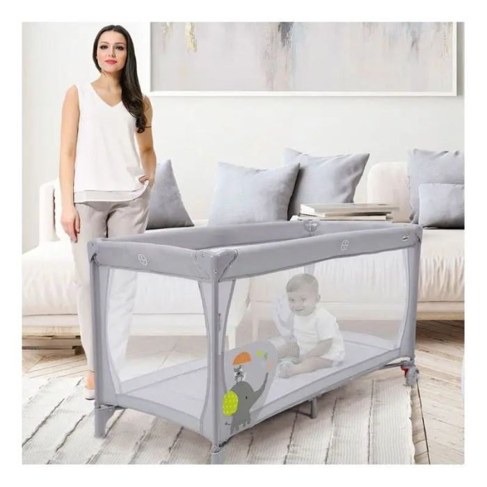· Desde el nacimiento hasta los 15 kg · 4 laterales de malla · 2 ruedas con freno · Diseño sólido · Doble cierre de seguridad · Base acolchada y bolsa de transporte incluida · Incluye ilustraciones en la cuna · Esquinas de plástico de colores