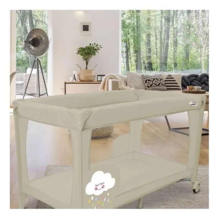 · Desde el nacimiento hasta los 15 kg · 4 laterales de malla · 2 ruedas con freno · Diseño sólido · Doble cierre de seguridad · Base acolchada y bolsa de transporte incluida · Incluye ilustraciones en la cuna · Esquinas de plástico de colores