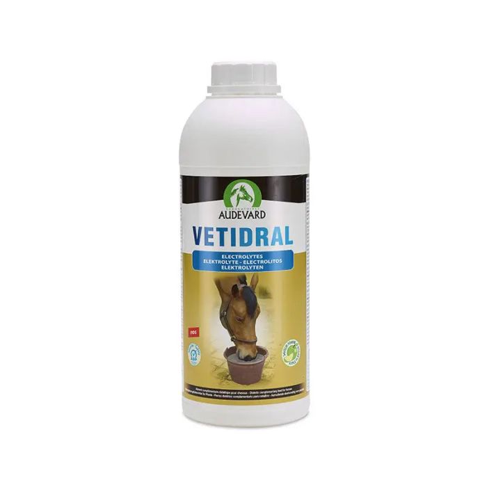VETIDRAL es un alimento complementario formulado por Laboratorios AUDEVARD. Ha sido diseñado para ayudar a compensar la pérdida de electrolitos en caso de sudoración intensa en caballos, después de un esfuerzo intenso, durante altas temperaturas, etc.Los usuarios de VETIDRAL aprecian su practicidad. Dependiendo de las circunstancias utilizan el polvo o la solución.PresentaciónEnvase de 1 L - Permite una duración de uso de hasta 20 días.FórmulaLa fórmula de VETIDRAL aporta electrolitos en las mismas proporciones que el sudor para compensar las pérdidas. También aporta prebióticos para estimular la recuperación y absorción de electrolitos.ConsejoLos electrolitos a menudo se dan después del ejercicio, pero es aún más efectivo distribuirlos también en los días anteriores al ejercicio para que el caballo pueda acumular sus reservas.Modo de empleo: Ayuda a compensar la pérdida de electrolitos en caso de sudoración intensa del caballo, tras un esfuerzo intenso, con temperaturas elevadas,...Ingesta diaria: 50 ml al día, durante 1 a 3 días. Agite bien antes de usar. Verter sobre el pienso o dar directamente en la boca del caballo. Las cantidades se pueden duplicar cuando la sudoración es particularmente abundante. Agua permanentemente disponible.