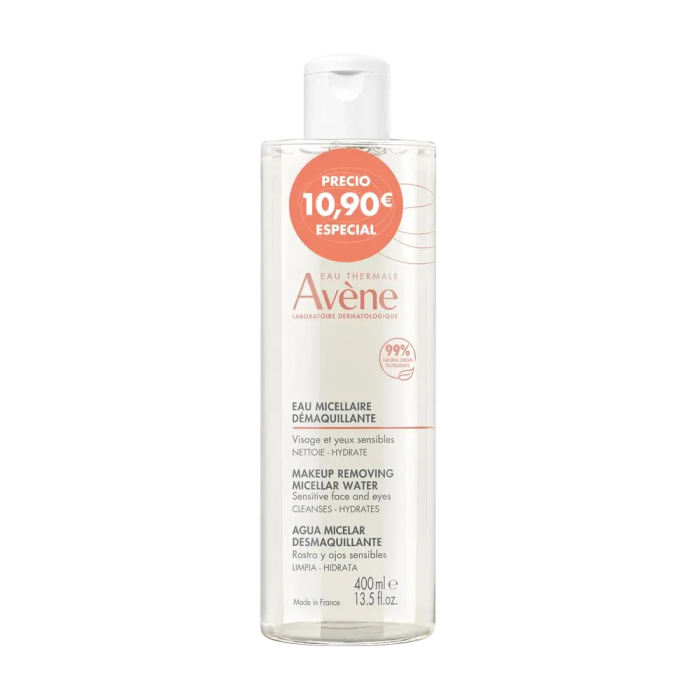 Esta agua micelar desmaquillante limpia (incluso las partículas de contaminación*), hidrata** y calma el rostro y los ojos sensibles en un solo paso. Contiene un 99 % de ingredientes de origen natural y ninguno de origen animal. Deja la piel limpia, suave, calmada y cómoda. A diario, esta agua refrescante de fragancia delicada desmaquilla y aporta suavidad en un solo y rápido paso. Mejora la hidratación y preserva el equilibrio natural de la piel gracias a la combinación de glicerina y trehalosa, y a la alta concentración de Agua termal de Avène, con sus propiedades calmantes. Su fórmula contiene un mínimo de ingredientes en la dosis justa para garantizar la eficacia y la tolerancia***. El bote de diseño ecológico está hecho de plástico reciclado****, y puede volver a reciclarse. El agua micelar desmaquillante es adecuada para los usuarios de lentillas. El envase del agua micelar desmaquillante de 400 ml está fabricado con un 87 % de materiales reciclados. El bote está hecho de plástico 100 % reciclado****.* Evaluación de la cantidad de micropartículas restantes tras una única aplicación en 27 sujetos** capas superiores de la piel *** Estudio monocéntrico realizado en 32 sujetos con piel y ojos sensibles, aplicado dos veces al día en el rostro, ojos, labios y escote **** excluyendo el tapón