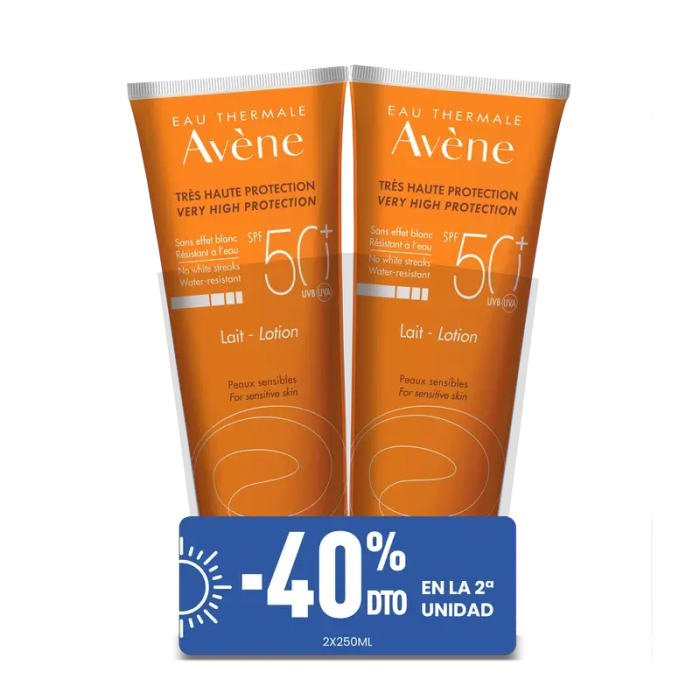 Aplicada sobre el rostro y el cuerpo, la Leche SPF 50+, con textura hidratante y protectora, ofrece una sensación de comodidad inmediata y duradera, un efecto antisequedad y una hidratación durante seis horas. Muy alta protección solar para pieles sensibles expuestas a la luz solar intensa.En el núcleo de la Leche SPF 50+ se encuentra la exclusiva protección Sunsitive® protection desarrollada por Pierre Fabre y compuesta por :- Un sistema de filtros patentado que contiene únicamente cuatro filtros solares, para una protección UVB-UVA muy amplia, estable y eficaz a lo largo del tiempo, además de una tolerancia cutánea óptima.- Provitamina E (pretocoferil), un potente antioxidante, para proteger las células contra los radicales libres.- Agua termal de Avène, conocida por sus propiedades calmantes, antiirritantes y suavizantes.Beneficios:• FOTOPROTECTORA : filtros fotoestables UVB-UVA que combaten los efectos nocivos de los rayos solares.• ANTIOXIDANTE : ayuda a proteger las células contra los radicales libres.• RESISTENTE AL AGUA : protege la piel contra los efectos nocivos del sol incluso al nadar.• HIDRATANTE : hidrata las capas superiores de la piel.• SIN ACABADO BLANQUECINO : deja una tez natural y una protección invisible.