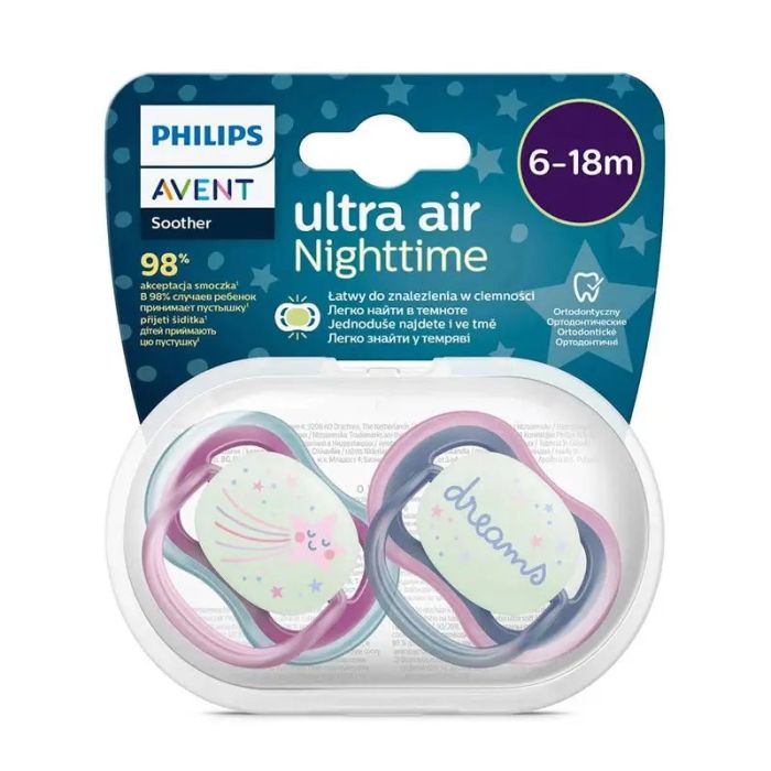 Chupetes Avent Ultra Air para niñas de 6-18 meses, diseñados para la noche.