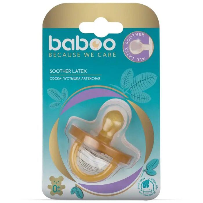 Chupete de látex, 0+ meses. USO: Esterilizar en agua hirvida durante un máximo de 5 minutos antes del primer uso y en cada uso. No utilizar productos de limpieza abrasivos. Puede esterilizarse en un esterilizador de vapor especial. No calentar en el microondas. Apto para lavavajillas. No dejar al calor ni a la luz solar directa. Compruébelo antes de cada uso. Si observa algún daño, sustitúyalo por uno nuevo. Este producto no es un juguete. Mantener fuera del alcance de los niños cuando no se utilice. No se recomienda su uso durante más de 2 meses. El embalaje no forma parte del producto. Más información: www.baboo.baby. País de origen: Tailandia. Importador - UAB Sentija, Tuskulėnų 13A-22, Vilnius, Lituania, baboo@sentija.com.