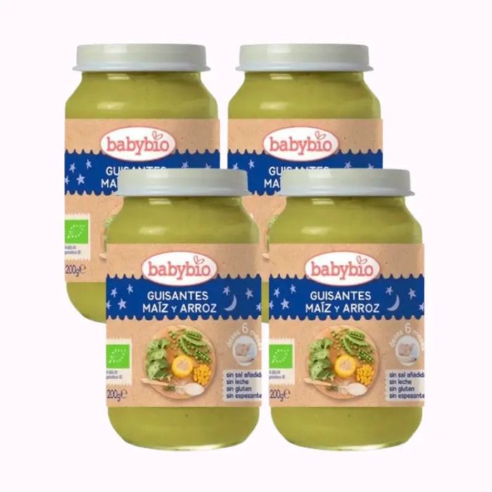 Babybio Buenas Noches Guisantes-Maiz-Arroz, Pack 4 x 200 gr
