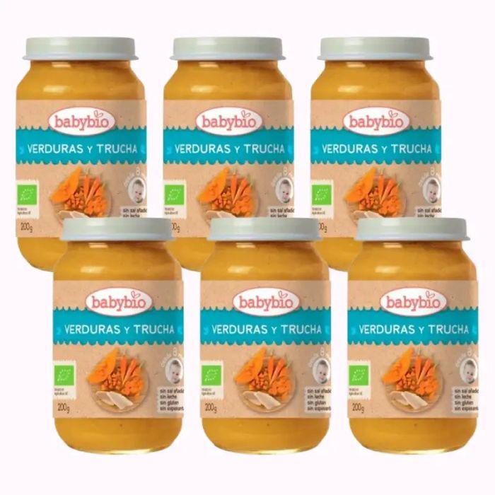 Crema de verduras con trucha para bebes a partir de 8 meses. Babybio selecciona cuidadosamente sus ingredientes, 100% procedentes de agricultura ecológica. No contiene sal añadida, glute ni leche.