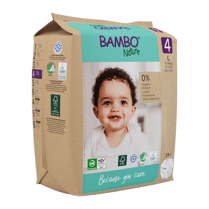 Los pañales Bambo Nature Talla 4 ofrecen una protección superior y duradera para los bebés que pesan entre 7 y 14 kg. Incorporan una avanzada tecnología de canales, que distribuye de manera uniforme la humedad por todo el pañal, permitiendo una absorción rápida y eficaz. Esto asegura que la piel de tu bebé se mantenga seca y protegida durante más tiempo, reduciendo significativamente el riesgo de irritaciones.Con una mayor capacidad de absorción, estos pañales son ideales para el uso prolongado, proporcionando tranquilidad tanto de día como de noche. Además, cuentan con un indicador de humedad, que te avisa cuando es el momento de cambiar el pañal, garantizando la máxima comodidad para tu bebé.Estos pañales cuentan con certificaciones Nordic Swan, EU Ecolabel y FSC, que avalan su compromiso con el medio ambiente y aseguran que están fabricados con materias primas de fuentes responsables. También han sido dermatológicamente probados, lo que los hace perfectos para bebés con piel sensible, gracias a la certificación Asthma Allergy Nordic.Los pañales vienen en una bolsa de papel reciclable, certificada por TUV Austria como material biobased, contribuyendo a la reducción del uso de plásticos y promoviendo el reciclaje.
