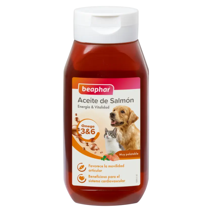 Golosinas y snacks de aceite de salmón Beaphar El aceite de salmón para perros Beaphar es un complemento alimenticio energético ideal para tu mejor amigo. Favorece la digestión y completa la dieta de tu mascota. Este aceite es rico en ácidos grasos omega 3 y 6, beneficiosos para el sistema cardiovascular del rey de la casa. Además, da flexibilidad a sus articulaciones, ayuda a mantener su piel sana, su pelo brillante y le aporta la energía necesaria para el día a día.