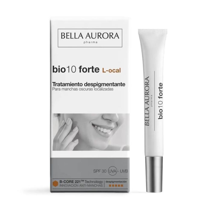 Ideal para: • Eliminar manchas oscuras localizadas. • Unificar el tono de la piel. • Aplicar con precisión sobre la zona hiperpigmentada. Eficacia: · Con B-CORE 221TM*, exclusiva tecnología despigmentante de Bella Aurora. Un sistema de encapsulado y liberación dirigida que actúa directamente sobre las zonas oscuras, obteniendo la máxima eficacia. · Con pigmentos iluminadores que ayudan a mantener el tono uniforme de la piel. · Con extracto de semillas de soja de origen 100% natural, certificado Cosmos (ISO16128), que favorece la absorción de los activos en la piel. Nivel despigmentación: Muy alto Resultados: Tras 4 semanas, atenúa las manchas existentes. COMPOSICIÓN Aqua, Dibutyl Adipate, Ethylhexyl Salicylate, Butyl Methoxydibenzoylmethane, Bis-Ethylhexyloxyphenol Methoxyphenyl Triazine, C12-15 Alkyl Benzoate, Ethylhexyl Triazone, Propanediol, Glycerin, Ascorbyl Glucoside, Ethylhexyl Methoxycinnamate, Vinyl Dimethicone/Methicone Silsesquioxane Crosspolymer, Mannitol, Phosphatidylcholine, Sclareolide, Saccharide Isomerate, Tocopherol, Kojic Acid, Palmitoyl Sh-Tripeptide-5 Norisoleucyl Sh-Nonapeptide-1, Glycine Soja Seed Extract, Phenylpropanol, Hydroxyethyl Acrylate/Sodium Acryloyldimethyl Taurate Copolymer, Glyceryl Stearate, Caprylyl Glycol, Sodium Hydroxide, Polyacrylate Crosspolymer-6, Sodium Phytate, Xanthan Gum, Lactic Acid, Ceteareth-20, Sodium Citrate, Cholesterol, Ceteareth-12, Cetearyl Alcohol, Cetyl Palmitate, Polysorbate 60, Sorbitan Isostearate, Polysorbate 80, Silica, Disodium EDTA, Tin Oxide, Sodium Chloride, BHT, Glyceryl Caprylate, Lactic Acid/Glycolic Acid Copolymer, Polyvinyl Alcohol, Phenoxyethanol, Potassium Sorbate, Sodium Benzoate, CI 77891, Parfum. MODO DE EMPLEO Aplicar 2 veces al día, durante un mínimo de 8 semanas. Aplicar directamente sobre la zona hiperpigmentada con ayuda del aplicador roll-on. Se recomienda complementar el tratamiento con un protector solar de elevado factor de protección para prevenir la aparición de nuevas manchas. Exfoliar la piel 1 o 2 veces a la semana. CONSEJO FARMACEUTICO Aplicar 2 veces al día, durante un mínimo de 8 semanas. Aplicar directamente sobre la zona hiperpigmentada con ayuda del aplicador roll-on. Se recomienda complementar el tratamiento con un protector solar de elevado factor de protección para prevenir la aparición de nuevas manchas. Exfoliar la piel 1 o 2 veces a la semana.