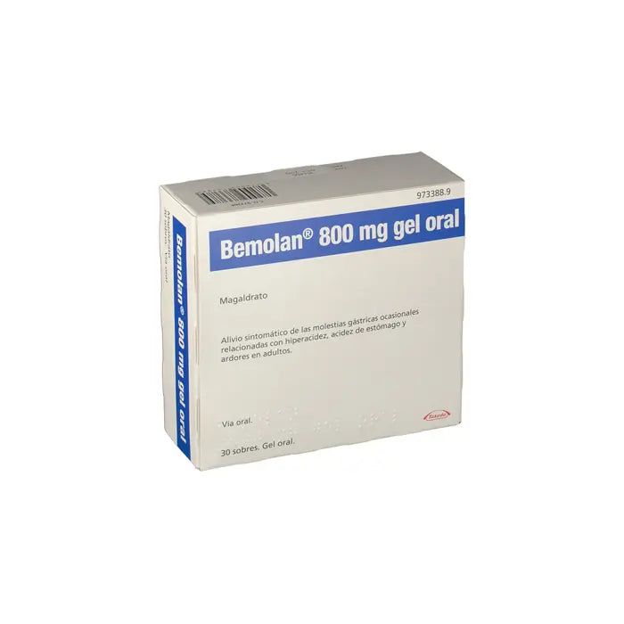 El principio activo de Bemolan es el magaldrato. Un sobre de 10 ml contiene 800 mg de magaldrato. El resto de componentes son: goma arábiga, hipromelosa, maltol, ciclamato de sodio, simeticona, metilcelulosa, ácido sórbico, sulfato de plata, digluconato de clorhexidina (solución acuosa al 20%), aroma de crema, aroma de caramelo, agua purificada.