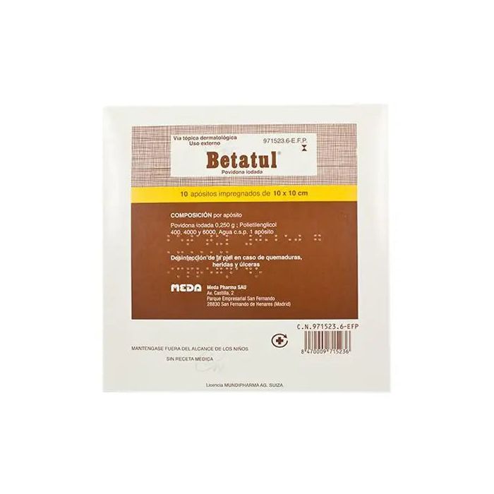 El principio activo de Betatul es la povidona iodada. Cada apósito impregnado de gel de 10 x 10 cm contiene 250 mg de povidona iodada. El resto de excipientes son: polietilenglicol 400, polietilenglicol 4000, polietilenglicol 6000, agua purificada y gasa hidrófila.