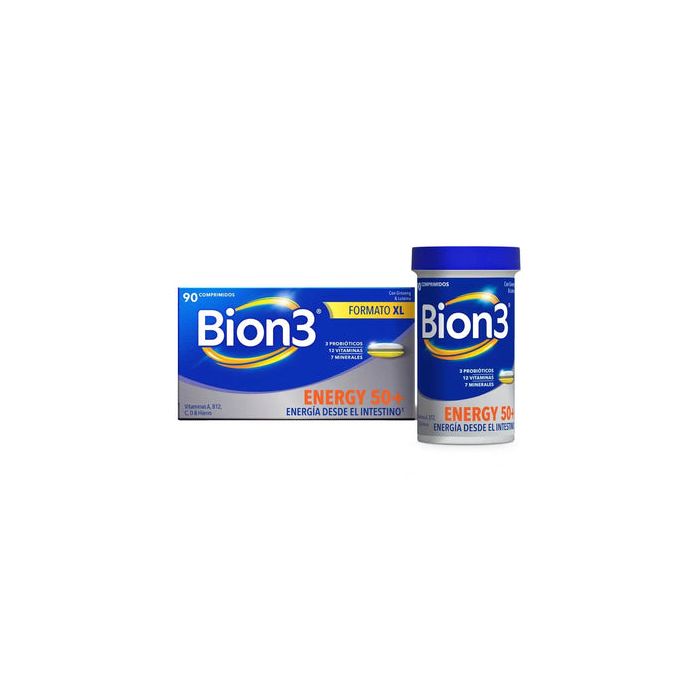 "Mantén tu energía recargada a lo largo del día con el nuevo multivitamínico Bion3 Energy 50+ en comprimidos - Energía desde el intestino.¡Todos necesitamos energía para nuestra vida diaria! ¡Sin embargo, no se puede tener energía sin cuidar del intestino! El intestino es la clave para el metabolismo energético , ya que es donde se absorben los nutrientes esenciales como las vitaminas y los minerales.Los nuevos comprimidos Bion3 Energy 50+ han sido específicamente formulados para adultos 50+, con una mezcla única de probióticos, minerales y vitaminas para ayudar al intestino y ayudar mantener los niveles de energía mental y física.Cada comprimido contiene 12 vitaminas esenciales y 7 minerales, incluyendo Vitaminas B12, B1, B2, B3, B5, B6 y B7 para ayudar al metabolismo energético, Vitamina C y Hierro para ayudar a reducir el cansancio y la fatiga, Vitamina A y Zinc para ayudar a la visión y Vitamina D para ayudar a la salud de los huesos.Además, los comprimidos Bion3 Energy 50+ contienen Vitaminas B2, B3 y B7 para ayudar al intestino, así como 10 millones de probióticos (L. gasseri, B. bifidum, B. longum) que llegan vivos al intestino.La dosis recomendada para adultos (18+) es de 1 comprimido al día, que debe ser tomado con una bebida fría durante o inmediatamente después de cualquier comida. Los complementos alimenticios no deben utilizarse como sustitutos de una dieta variada y equilibrada ni un estilo de vida saludable.Las vitaminas B1, B2, B3 (niacina), B5, B6, B7 (Biotina) y B12 contribuyen al metabolismo energético normal. La vitamina C y el hierro contribuyen a la reducción del cansancio y la fatiga. Las vitaminas B2, B3 y B7 contribuyen al mantenimiento normal de las membranas mucosas, por ejemplo, la intestinal. El intestino es clave para el metabolismo energético, ya que es donde se absorben los nutrientes esenciales como vitaminas y minerales.La vitamina A contribuye al mantenimiento de la visión en condiciones normales.La vitamina D contribuye al mantenimiento de los huesos en condiciones normales.Unidades Formadoras de Colonias"
