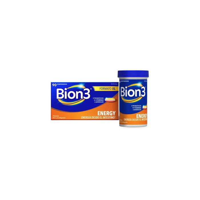 "Mantén tu energía recargada a lo largo del día con el nuevo multivitamínico Bion3 Energy en comprimidos - Energía desde el intestino.¡Todos necesitamos energía para nuestra vida diaria! ¡Sin embargo, no se puede tener energía sin cuidar del intestino! El intestino es la clave para el metabolismo energético , ya que es donde se absorben los nutrientes esenciales como las vitaminas y los minerales.Los nuevos comprimidos Bion3 Energy han sido formuladas específicamente con una mezcla única de probióticos, minerales y vitaminas para ayudar al intestino y ayudar a mantener los niveles de energía mental y física.Cada comprimido contiene 10 vitaminas esenciales y 4 minerales, incluyendo Vitaminas B12, B1, B2, B3, B6 y B7 para ayudar al metabolismo energético, Vitamina B5 para ayudar el rendimiento mental, así como Vitamina C y Magnesio para ayudar a reducir el cansancio y la fatiga.Además, los comprimidos Bion3 Energy contienen Vitaminas B2, B3 y B7 para ayudar al intestino, así como 10 millones de probióticos (L. gasseri, B. bifidum, B. longum) que llegan vivos al intestino.Pero eso no es todo: gracias a su tecnología de liberación prolongada, que libera vitamina C, B1, B2, B3, B5 y B6 durante 6 horas, los comprimidos de Bion3 Energy son una excelente opción para todos los que buscan mantener sus niveles de energía durante el día. La dosis recomendada para adultos (18+) es de 1 comprimido al día, que debe ser tomado con una bebida fría durante o inmediatamente después de cualquier comida. Los complementos alimenticios no deben utilizarse como sustitutos de una dieta variada y equilibrada ni un estilo de vida saludable.Las vitaminas B1, B2, B3 (niacina), B5, B6, B12, C y el magnesio contribuyen al metabolismo energético normal. Las vitaminas B12, C y el magnesio contribuyen a la reducción del cansancio y la fatiga. Las vitaminas B2, B3 y B7 contribuyen al mantenimiento normal de las membranas mucosas, por ejemplo, la intestinal. El intestino es clave para el metabolismo energético, ya que es donde se absorben los nutrientes esenciales como vitaminas y minerales.Liberación prolongada de vitaminas B1, B2, B3, B5, B6 y C durante 6 horas para tener energía durante el día.Unidades Formadoras de Colonias"