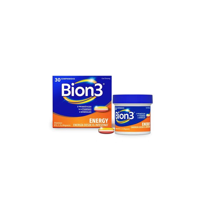 "Mantén tu energía recargada a lo largo del día con el nuevo multivitamínico Bion3 Energy en comprimidos - Energía desde el intestino.¡Todos necesitamos energía para nuestra vida diaria! ¡Sin embargo, no se puede tener energía sin cuidar del intestino! El intestino es la clave para el metabolismo energético , ya que es donde se absorben los nutrientes esenciales como las vitaminas y los minerales.Los nuevos comprimidos Bion3 Energy han sido formuladas específicamente con una mezcla única de probióticos, minerales y vitaminas para ayudar al intestino y ayudar a mantener los niveles de energía mental y física.Cada comprimido contiene 10 vitaminas esenciales y 4 minerales, incluyendo Vitaminas B12, B1, B2, B3, B6 y B7 para ayudar al metabolismo energético, Vitamina B5 para ayudar el rendimiento mental, así como Vitamina C y Magnesio para ayudar a reducir el cansancio y la fatiga.Además, los comprimidos Bion3 Energy contienen Vitaminas B2, B3 y B7 para ayudar al intestino, así como 10 millones de probióticos (L. gasseri, B. bifidum, B. longum) que llegan vivos al intestino.Pero eso no es todo: gracias a su tecnología de liberación prolongada, que libera vitamina C, B1, B2, B3, B5 y B6 durante 6 horas, los comprimidos de Bion3 Energy son una excelente opción para todos los que buscan mantener sus niveles de energía durante el día. La dosis recomendada para adultos (18+) es de 1 comprimido al día, que debe ser tomado con una bebida fría durante o inmediatamente después de cualquier comida. Los complementos alimenticios no deben utilizarse como sustitutos de una dieta variada y equilibrada ni un estilo de vida saludable.Las vitaminas B1, B2, B3 (niacina), B5, B6, B12, C y el magnesio contribuyen al metabolismo energético normal. Las vitaminas B12, C y el magnesio contribuyen a la reducción del cansancio y la fatiga. Las vitaminas B2, B3 y B7 contribuyen al mantenimiento normal de las membranas mucosas, por ejemplo, la intestinal. El intestino es clave para el metabolismo energético, ya que es donde se absorben los nutrientes esenciales como vitaminas y minerales.Liberación prolongada de vitaminas B1, B2, B3, B5, B6 y C durante 6 horas para tener energía durante el día.Unidades Formadoras de Colonias"