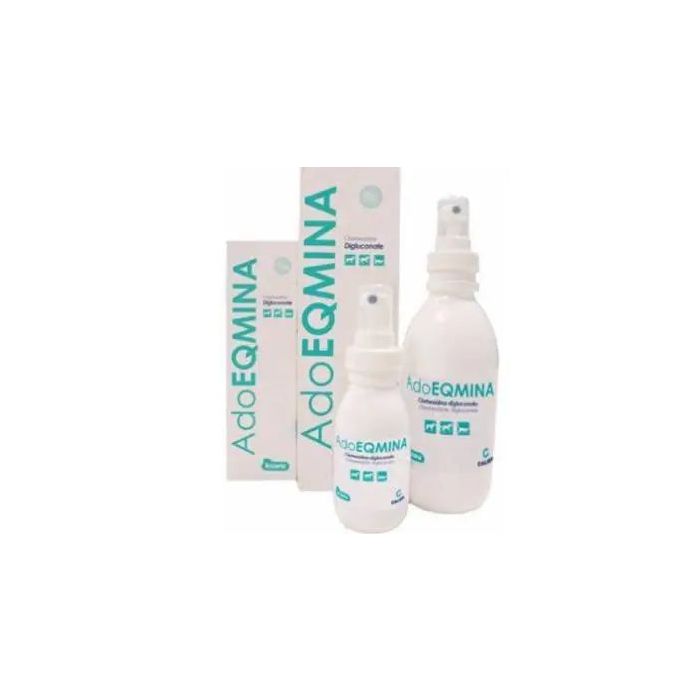 La clorhexidina es un compuesto de estructura biguanida con actividad antiséptica. Su acción es de carácter bactericida y bacteriostática. Posee un amplio espectro antibacteriano, siendo activa frente a gérmenes Gram (+) y Gram (-), tales como Serratia marcescens, Streptococcus uberis, Staphylococcus aureus y Escherichia coli. Algunos Gram (-) son relativamente resistentes. No posee acción esporicida. Indicaciones: Antiséptico de úlceras y heridas en general, afecciones de las extremidades, antiséptico en rozaduras y quemaduras leves, antiséptico del campo operatorio y de las manos del veterinario, desinfección de las zonas de punción, limpieza y desinfección del pabellón auricular. Efectos secundarios: Ocasionalmente puede dar lugar a reacciones de fotosensibilización. El uso repetitivo, durante largo tiempo, puede producir en algunos casos dermatitis. Vía de administración: Tópica. Posología: Debido a la buena tolerancia del preparado, puede aplicarse tópicamente cuantas veces sea necesario. Aunque el aplicador constituye el modo de aplicación idóneo, también puede aplicarse mediante toques con una torunda de algodón empapada en Adoeqmina.