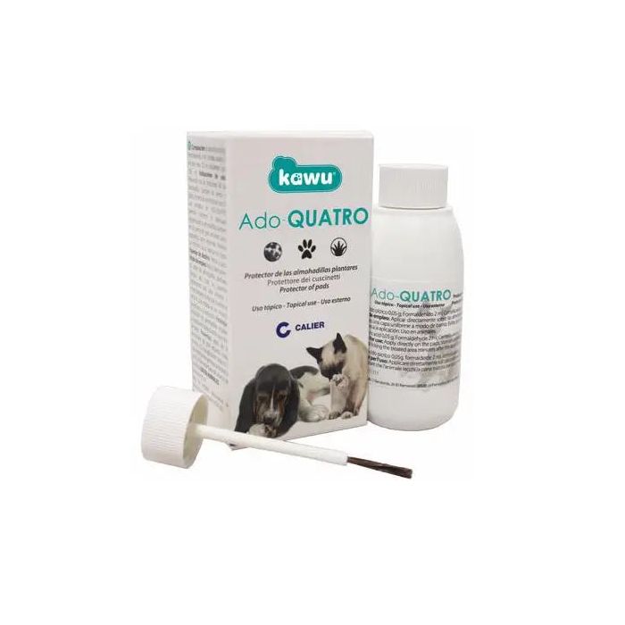 Previene de las irritaciones de las almohadillas plantares de perros y gatos. Aumenta la resistencia al roce.El uso periódico de ADO-QUATRO permite mantener la adecuada resistencia de las almohadillas plantares en los perros de gran actividad, tanto esporádica como sostenida.Previene su irritación, causa habitual de cojera.Utilizar tras largos paseos, ejercicio intenso etc. para curar las heridasModo de empleo: Presionar con el aplicador directamente sobre las almohadillas plantares. Deslizar por toda la superficie depositando una capa uniforme a modo de barniz. Evitar que el animal se lama la zona tratada en los minutos porteriores a la aplicación.Composición:Centella asiatica: 3 ml/100 mlAloe vera: 0.1 ml/100 mlLa Centella asiática tiene un alto poder regenerador de los tejidos y ayuda a la cicatrización de las heridas.