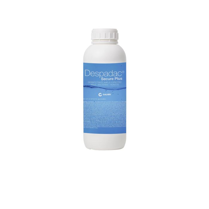 Despadac Secure Plus 1 LitroDesinfectante, recomendado para superficiesMás información:DESPADAC SECURE PLUSCARACTERÍSTICASDesinfectante de última generación que combina dos principios activos que unidos ejercen una acción desinfectante de muy amplio espectro y a dosis de uso reducidas.Para la desinfección de naves, locales e instalaciones usadas en ganadería, avicultura y cunicultura, perreras, etc. Asimismo, puede ser utilizado en la desinfección de utensilios, maquinaria y aparatos, medios de transporte, clínicas veterinarias y mataderos.Activo frente al virus de la peste porcina africana de acuerdo al estudio standard modificado EN 14675.COMPOSICIÓNGlutaraldehído: 14%Didecil dimetil cloruro de amonio: 10%Envases de 1 litro, 5 litros y 25 litros.USOSe puede utilizar por frotamiento, pulverización y nebulización, y en vados sanitarios.Diluir el producto en agua fría a las siguientes proporciones:Locales y recintos:Desinfección rutinaria: 30-25 ml en 10 L agua.Desinfección estricta: 100-70 ml en 10 L agua.Nebulización y termonebulización: 1 L en 3 L agua.Utensilios: 50 ml en 10 L agua.Medios de transporte: 50 ml en 10 L agua.Vados sanitarios: 100 ml en 10 L agua.VENTAJASAcción desinfectante inmediata e intensa frente a virus, bacterias y hongos, incluso en presencia de materia orgánica.Aplicar el producto diluido en agua sobre la superficie del material a desinfectar.