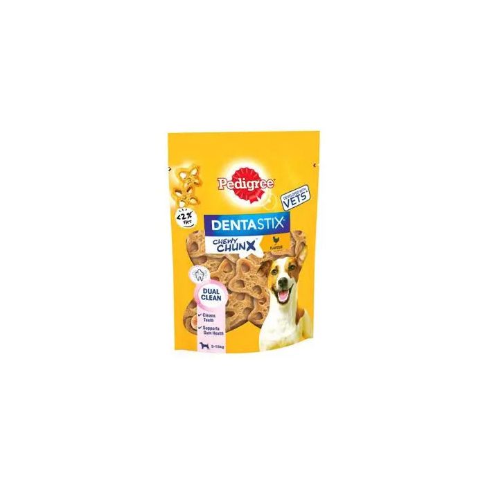 Dentastix Chewy Chunx es una opción diseñada para el cuidado dental de los perros. Este pack contiene 5 bolsas individuales, cada una con 68 gramos de chunx masticables de tamaño mediano. Los Dentastix Chewy Chunx están formulados con textura y diseño especial para ayudar a limpiar los dientes y reducir la acumulación de placa y sarro. Además, son deliciosos y altamente apetecibles para los perros, lo que facilita su incorporación a la rutina diaria de cuidado bucal de tu mascota.