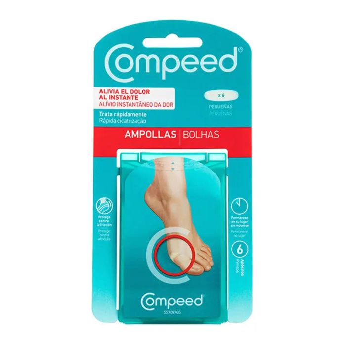 Los apósitos COMPEED® Ampollas Pequeñas Absorben el exceso de fluido formando un gel protector y unas condiciones óptimas de curación. Especialmente diseñado para las ampollas de los dedos de los pies que a veces son difíciles de curar. Contiene 6 apósitos. Composición GEL HIDROCOLOIDE Modo de empleo 1. Limpia y seca la piel antes de usarlo, asegurándote que la zona de la ampolla esté libre de restos de cremas y aceites. 2. Retira el papel inferior, evitando tocar el lado adhesivo. 3. Aplica el apósito firmemente sobre la ampolla, asegurándote de que los bordes estén bien alisados. 4. Mantenlo en su sitio hasta que comience a desprenderse (Nota: puede permanecer adherido en su lugar hasta varios días). 5. Para quitar el apósito: no tires hacia arriba. Tienes que estirar lentamente a lo largo de la piel.