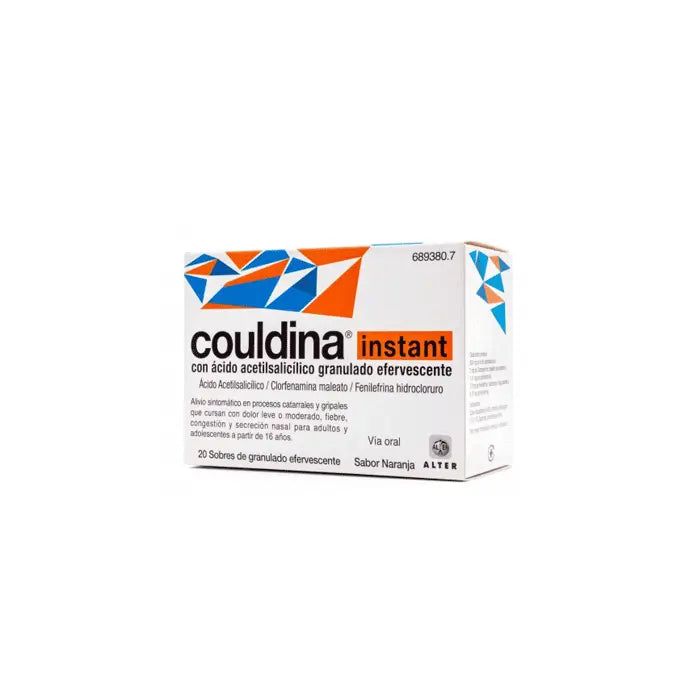 Los principios activos de Couldina Instant son: ácido acetilsalicílico, maleato de clorfenamina, hidrocloruro de Fenilefrina. Cada sobre contiene 500 mg de ácido acetilsalicílico, 2 mg de clorfenamina maleato y 7,5 mg de fenilefrina hidrocloruro. El resto de excipientes son: ácido cítrico anhidro (E-330), hidrógenocarbonato de sodio (E-500ii), carbonato sódico anhidro (E-500i), manitol (E-421), povidona K 30 (E-1201), glicina (E-640), docusato de sodio, aspartamo (E-951), sacarosa, sacarina sódica (E-954ii), aroma de naranja (preparado de aroma, sustancia natural aromatizante) y amarillo anaranjado S (E-110).