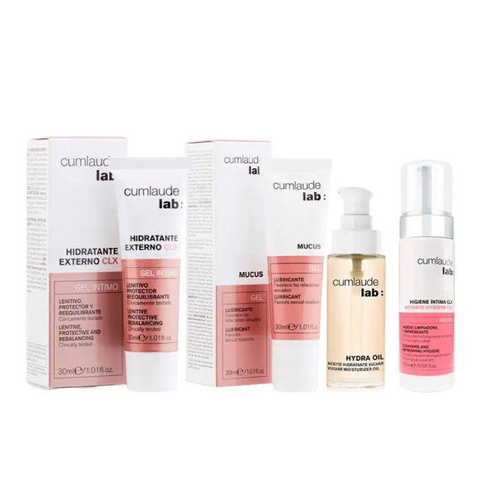 HIGIENE INTIMA CLX MOUSSE: Mousse para la higiene íntima formulada con clorhexidina y un complejo antimicrobiano vegetal de acción higienizante, refrescante y protectora. Con un pH fisiológico vulvar (5,5) para limpiar suavemente la zona íntima respetando el equilibrio superficial de la piel y las mucosas. Adecuada en caso de excesivo desarrollo de la flora microbiana local, embarazo, posparto, menstruación, etc. Su textura mousse permite una aplicación suave sin necesidad de ejercer fricción ni molestia en la zona. Clínica, dermatológica y microbiológicamente testado. Indicado en estados infecciosos y/o inflamatorios de la zona vulvar y vaginal. Especialmente en casos de episiotomía, durante el ciclo menstrual o después de las relaciones sexuales. HIDRATANTE EXTERNO CLX: Gel hidratante formulado con clorhexidina para la zona genital externa, indicado en estados inflamatorios y/o irritativos de la zona vulvar y el cuidado de la episiotomía. Con acción lenitiva, protectora y reequilibrante. Es compatible con el uso de preservativo. Indicado en casos de irritacion y prurito de la zona vulvar y en el cuidado de la episiotomía o agresiones externas. Sin parabenos. Sin colorantes. Sin perfume. Clínicamente testado. HYDRA OIL: Hydra Oil está compuesto por una combinación de aceites biotecnológicos 100% naturales de rápida absorción. Contiene, además, aceites de rosa mosqueta, centella asiática, almendras dulces y salvado de arroz con propiedades hidratantes, emolientes y regenerativas de la zona genital externa. Aceite hiratante de textura ligera, no mancha, ni contiene perfumes. Está indicado en caso de sequedad de los genitales externos en situaciones como: post-parto, toma de determinados medicamentos, fases del ciclo menstrual, transición hacia la menopausia y la etapa climatérica, etc. LUBRICANTE MUCUS: Lubricante especialmente indicado en caso de relaciones sexuales dolorosas y que cursan con sequedad, contrarrestando los síntomas de inflamación e irritación. De consistencia similar a las secreciones vaginales fisiológicas, mantiene la zona intima suave e hidratada. Respeta los valores recomendados por la OMS (pH y osmolalidad). Compatible con el uso del preservativo. No deja residuos. No mancha.