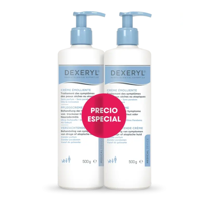 Dexeryl Crema de protección cutánea, destinada al tratamiento de los signos y síntomas de la sequedad de piel (xerosis) en particular en varias afecciones cutáneas (tales como dermatitis atópica, ictiosis...) y eritema inducido por radioterapia. Desde el nacimiento. Din perfume.DEXERYL crema se ha formulado para el tratamiento de los signos y síntomas de la sequedad de piel (xerosis) gracias a:- El “efecto filmógeno” de la vaselina y la parafina líquida que:• inhibe físicamente la evaporación, evitando así la deshidratación (pérdida de agua)• y constituye una barrera contra las agresiones externas;- además, el efecto hidratante del glicerol ayudaa mantener el equilibrio hídrico de la piel.Gracias a su formulación, DEXERYL crema también limita y evita las irritaciones.Ha demostrado eficacia en todas las xerosis: -50 % menos de sequedad de la piel¹, 50 % menos de brotes de dermatitis atópica², picor reducido y alivio de la tirantez. Gracias a Dexeryl Crema emoliente, la mitad de pacientes utilizaron corticosteroides. (1) Blanchet-Bardon C, Tadini G, Machadadado Matos M, Delarue A. J Eur Acad Dermatol Venereol. 2012 Aug; 26(8):1014-9. (2)Tiplica et al: Emollient Use in Children with AD. Pediatric Dermatology 2017legal: DEXERYL Crema EmolienteCrema de protección cutánea destinada al tratamiento de lossignos y síntomas de la sequedad de piel (xerosis) en particularen varias afecciones cutáneas (tales como dermatitis atópica,ictiosis...) y eritema inducido por radioterapia. No aplicar sobrelas heridas, mucosas o en los ojos.Producto sanitario. Este producto cumple con la legislación de producto sanitario.Beneficios:• Reduce el picor y la sequedad de la piel• Hidrata y restaura la barrera cutánea • Alivia la tirantez