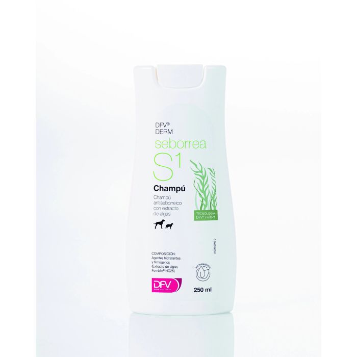 DFV® DERM Seborrea S1 ChampúChampú antiseborreico con extracto de algasCOMPOSICIÓN:Agentes hidratantes y filmógenos (Extracto de algas, Fomblin® HC25)Sin parabenos.PROPIEDADES: a composición de DFV® DERM SEBORREA S1 CHAMPÚ colabora en la constitución y mantenimiento fisiológico de la barrera cutánea, debilitada por el estado queratoseborreico que produce la alteración de la piel y del film lipídico superficial. Su aplicación local permite la reestructuración fisológica de la capacórnea y colabora en regular la seborrea. Por su parte los agentes hidratantes, detergentes y filmógenos aseguran una buena limpieza de los restos celulares, la permanencia de la piel activa y una buena hidratación y engrasamiento, después de su uso. DFV® DERM SEBORREA S1 CHAMPÚ colabora en mejorar el aspecto de la piel y el pelaje, disminuyendo el olor desagradable típico que aparece en los estados queratoseborreicos.INDICACIONES DE USO:Para perros y gatos. Cuidado y limpieza del pelo y la piel, que proporciona una protección fisiológica. De modo especial en los estados queratoseborreicos.MODO DE EMPLEO:Uso externo. Después de mojar al animal con agua templada, aplicar DFV® DERM SEBORREA S1 CHAMPÚ abundantemente sobre el pelo. Frotar hasta formar espuma. Dejar actuar el producto de 5 a 10 minutos antes de aclarar abundantemente. Repetir si es necesario.Frecuencia de uso:Usar de 2 a 3 veces por semana, durante 1 - 2 semanas. En caso de duda, se recomienda consultar con su veterinario.PRECAUCIONES DE EMPLEO:No ingerir. Evitar el contacto con los ojos.En caso de contacto con los ojos lavar con abundante agua.Presentación comercial: Envase de 250 ml.