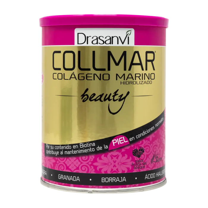 Complemento alimenticio con colágeno y frutas del bosque, diseñado para mejorar