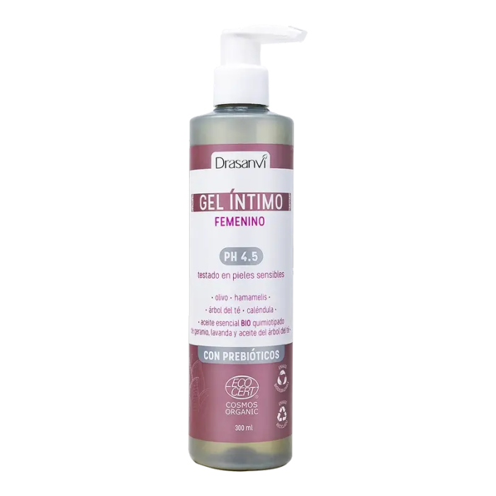 El Gel íntimo de Drasanvi, refresca y nutre intensamente la piel, ayudando a recuperar la vitalidadnatural de nuestra dermis. Además, tiene funciones calmantes, reparadoras y protectores. Suformulación está hecha a base de aloe vera ecológico, extracto de caléndula ecológico, extracto deolivo ecológico, aceite esencial de árbol de té ecológico, aceite esencial de lavanda ecológico, aceiteesencial de geranio ecológico y extracto de hamamelis. Contiene un pH 4.5 idóneo para el buencuidado de la zona íntima y destaca también en su composición, prebióticos que favorecen lageneración de la flora a la vez que la equilibran, mejorando así la salud e hidratación íntima.